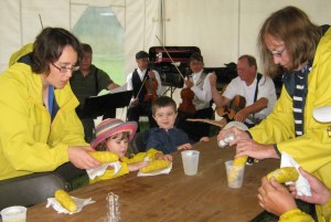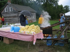 Despite the often heavy rain, Friends volunteers braved the elements to cook the corn outside. An enormous cast iron pot was set over a wood fire and soon the water was bubbling away. Local corn, picked the same day, was cooked to perfection by volunteers from the Friends and topped with melted butter. Festival visitors enjoyed their corn in the large tent at the Lally Homestead as they listened to the four-piece band Cratur.