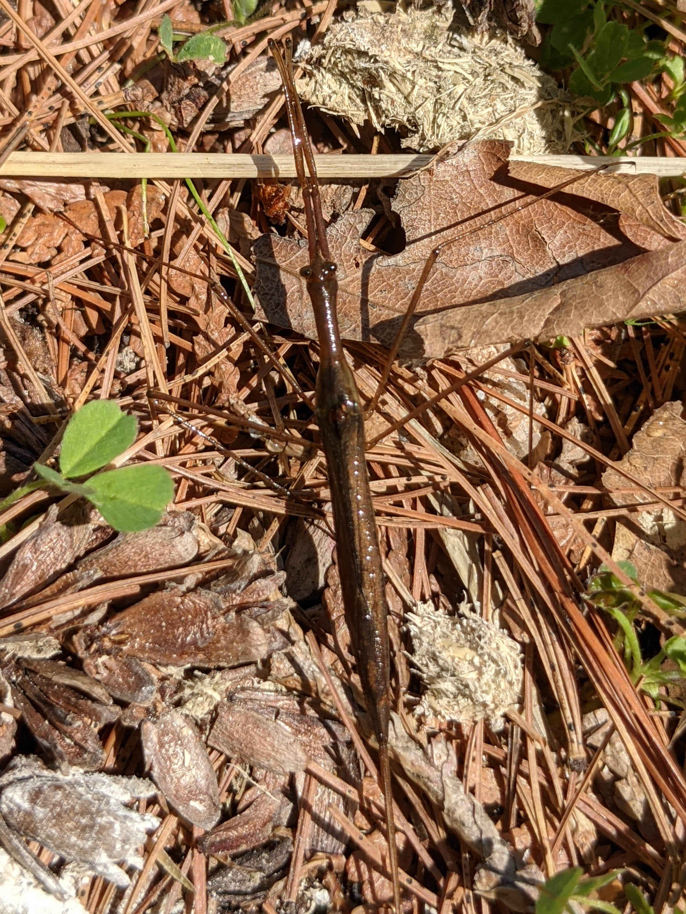 If you look closely at this picture, you’ll spot our #SpeciesOfTheWeek – the Brown Waterscorpion (Ranatra fusca)! Waterscorpions live in ponds and streams, hanging out on aquatic vegetation or right on shore where they like to bask in the sun. Occasionally they dry out their weak wings, which are usually kept flat on their back and mainly used if their home dries up. Waterscorpions are carnivorous stealth hunters (like herons!), lying on vegetation with their face in the water patiently looking for prey with their big eyes. When they spot a potential meal, they use their back legs to push themselves towards it, grab it with their long front arms, and impale it with their needle-like beak – sharp enough to cut human skin! Finally, they season their meal with digestive enzymes, like spiders do! These enzymes partially digest the prey’s tissue, turning it into a bug smoothie! A waterscorpion’s tail has a crucial role in hunting, but it’s very different from what land scorpions use their tails for… it’s actually a breathing tube! They keep a bubble of air between their front legs and abdomen at all times and use their tail to diffuse oxygen. This is why waterscorpions can spend so much time with their faces in the water without running out of air. Interestingly, waterscorpion eggs, which are laid in submerged vegetation or shoreside moss, also have respiratory filaments protruding from them. In the winter, waterscorpions survive under the ice because their metabolism is lowered so much by the cold that the little amount of oxygen they get via diffusion from the water is enough to sustain them. Have you spotted these cool long bugs at the park? Keep an eye out for them along the shore when you’re looking for frogs!