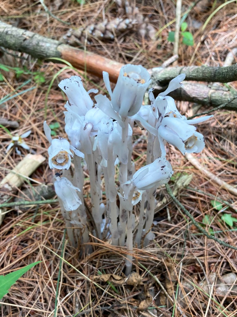 This week’s #SpeciesOfTheWeek is the Ghost Pipe (Monotropa uniflora). With its waxy white colour, it might be mistaken for a mushroom, but it is actually a perennial plant! However, it does not behave like a normal plant. The white colouration of Ghost Pipes comes from their complete lack of chlorophyll, which means they are unable to generate food from photosynthesis. Instead, this plant is a myco-heterotroph, and part of a complex relationship. Most plants have mycorrhizal fungi, which form a network in the roots and allow plants to exchange carbon and nutrients with other plants. Myco-heterotrophs like Ghost Pipe get their nutrients by parasitizing these mycorrhizal fungi. Ghost Pipe has a small range of host fungi, most of which are associated with beech trees. It is usually found in damp, shaded areas of mature forests. Ghost Pipe has a single flower with 3-8 petals, and it usually flowers during the summer and fall, a few days after rainfall. It only appears above ground when it flowers, and the flowering process lasts just one week. When the flower first opens it points downwards, but it straightens as it matures until it is pointing directly upwards. The plant then turns black, which is where its other name, Corpse Plant, comes from. This plant is highly sought after due to its short visible life cycle, perceived rarity, and uses in herbal medicine. However, it may be toxic to humans, so it is best to avoid picking it. Please remember that it is illegal to pick wild plants in a provincial park. If you wish to pick a plant for use in traditional medicine please contact the park naturalist.