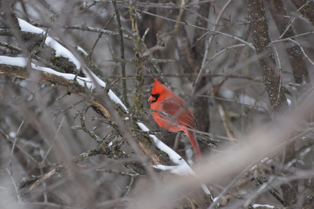 This week’s #SpeciesOfTheWeek is the Northern Cardinal (Cardinalis cardinalis). Most brightly-coloured birds have migrated south by this time of year, but the Cardinal stays here year-round and the male’s bright red plumage dramatically stands out in a winter forest. The female’s plumage is slightly drabber, but she still sports brilliant red highlights on her wings and crest and a bright red beak. Their loud whistling calls are a common sound on spring and summer mornings. Females will also sing while sitting on the nest, which is rare in North American songbirds. Cardinals are one species that has benefited from human expansion, as they use forest edge habitats that can be found at the edge of farmlands and suburban areas. Since they are seed-eaters, cardinals are common visitors to bird feeders and seem to have a preference for black oil sunflower seeds. Cardinals are very territorial and attack any perceived intruders – including their own reflections. During the breeding season, when hormone levels are high, both males and females may spend hours attacking their own reflection in windows, car mirrors, and other reflective surfaces. Treating windows to make them less reflective is one way you can help protect cardinals and other birds.