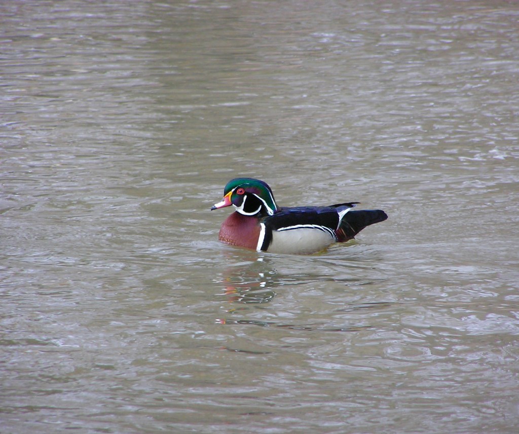 This bird is one of the many beautiful ducks of Canada and should just be arriving here this time of year on their breeding grounds where they will make their nests in trees. Wood Ducks are one of the easier ducks to identify because they have a unique shape with a boxy head on both the male and females and a bright colourful head and body on the males. The bill of the males is red, white, black and yellow and the rest of the face is glossy green with stark white patterning. Not only are these birds stunning, they also are very interesting nesters. Wood Ducks nest near water in cavities high up in trees, and when the eggs hatch the ducklings need to jump down and walk to the water. This sounds like no big deal, but the nests can be over 20m above the ground! It’s a good thing chicks leave the nest as soon as they hatch and are fluffy and small enough to break their fall!