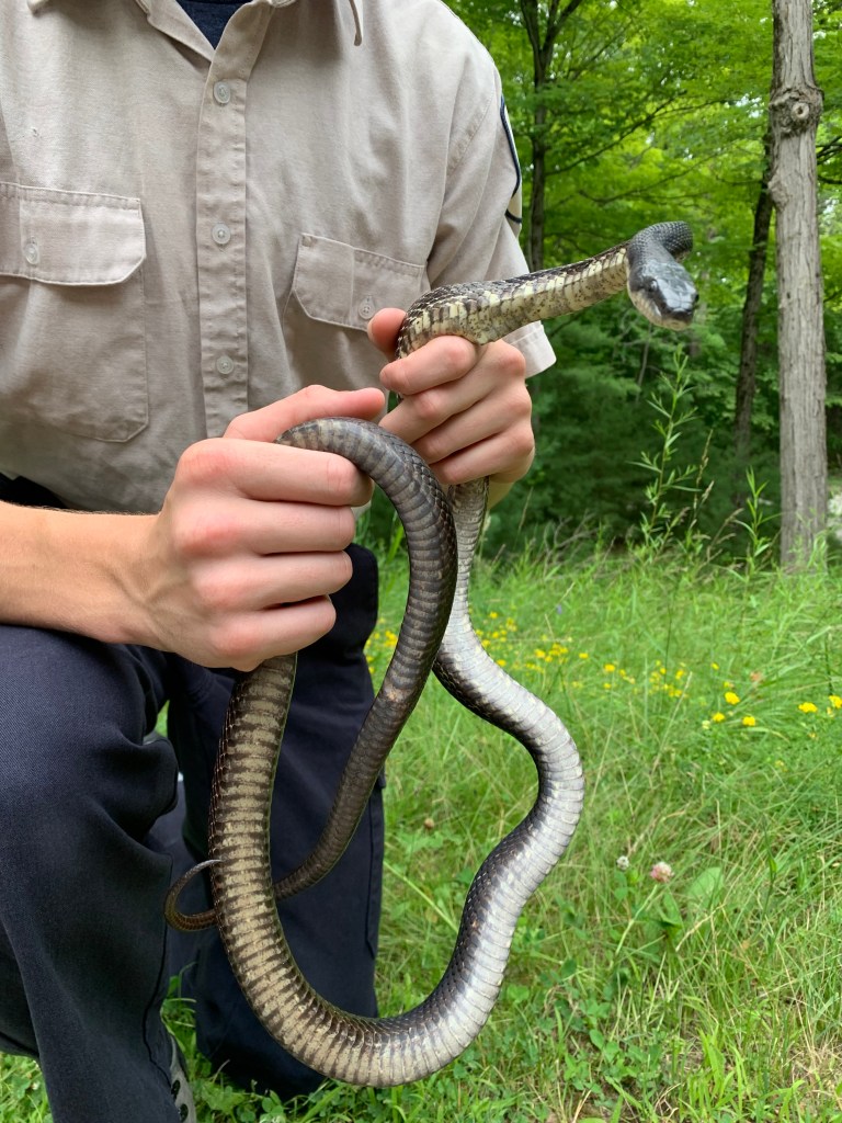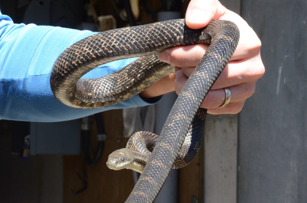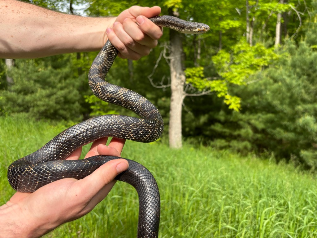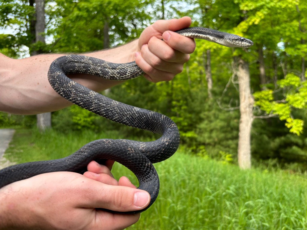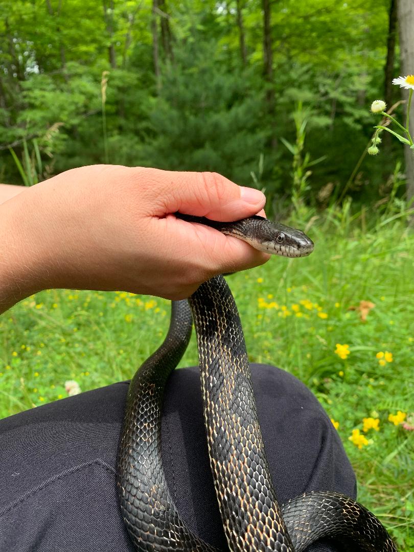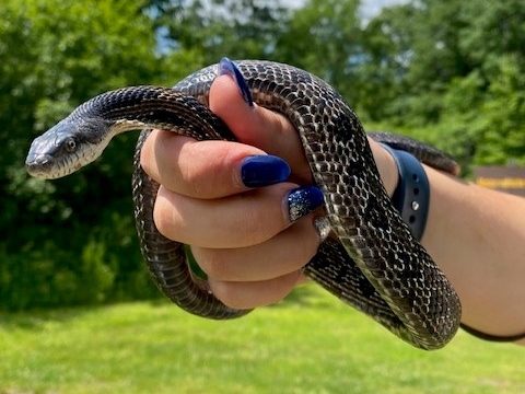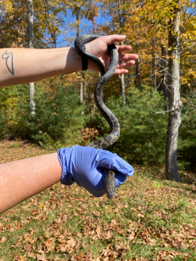 This male Gray Ratsnake was first found on July 30, 2021, near the bridge at McParlan House. He weighed 284 grams and measured 123.6 cm long. He was tense and somewhat unhappy to be found, and since staff didn’t have a pillowcase when he was found he was caught and carried to the van in a dragonfly net.