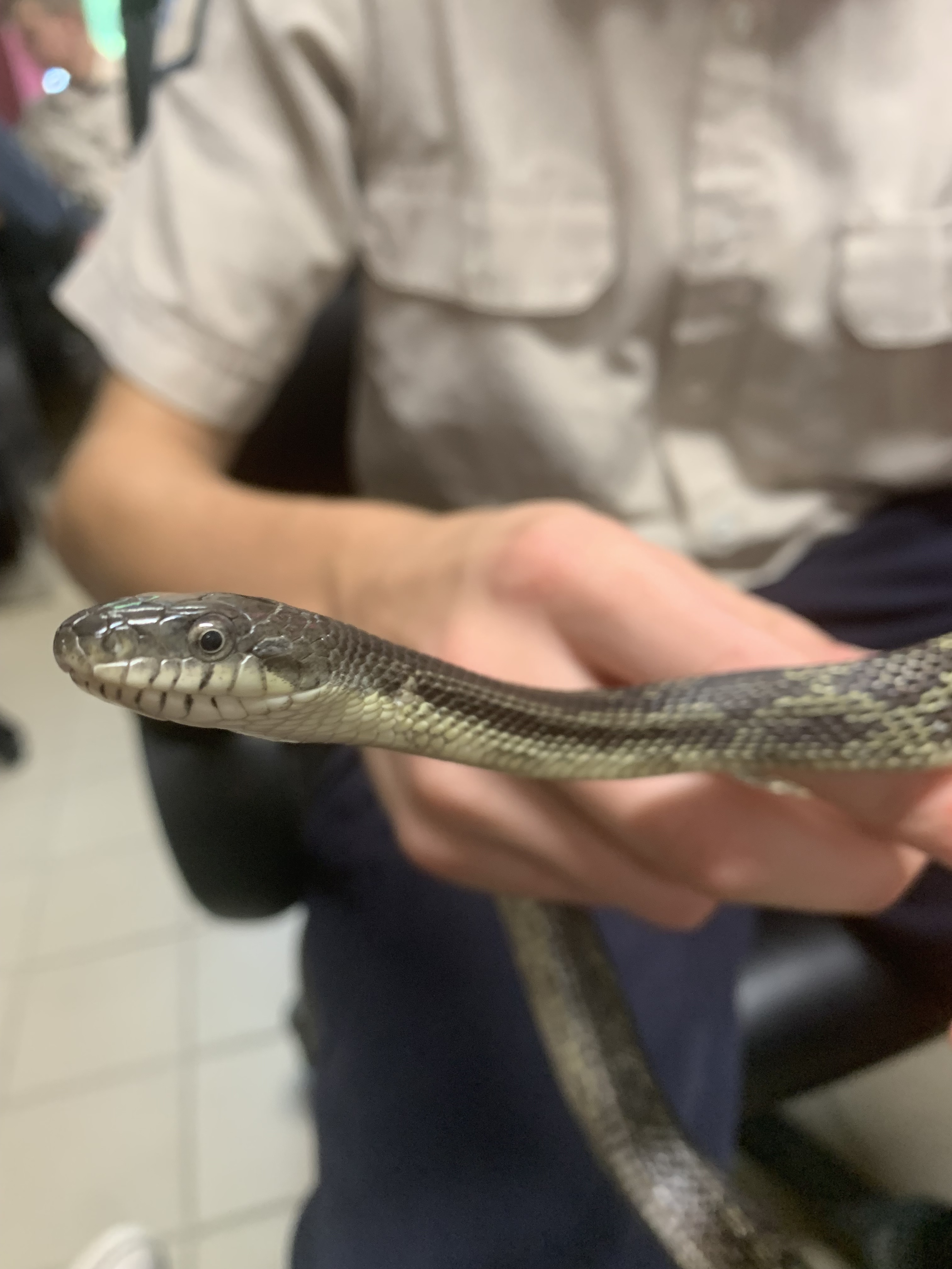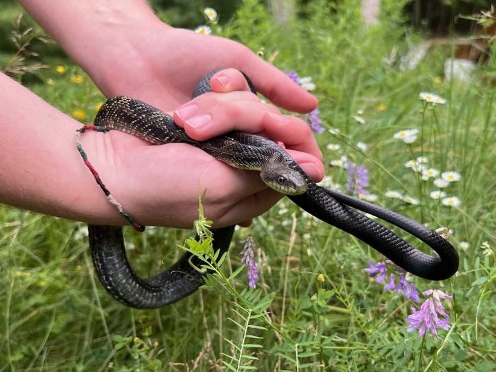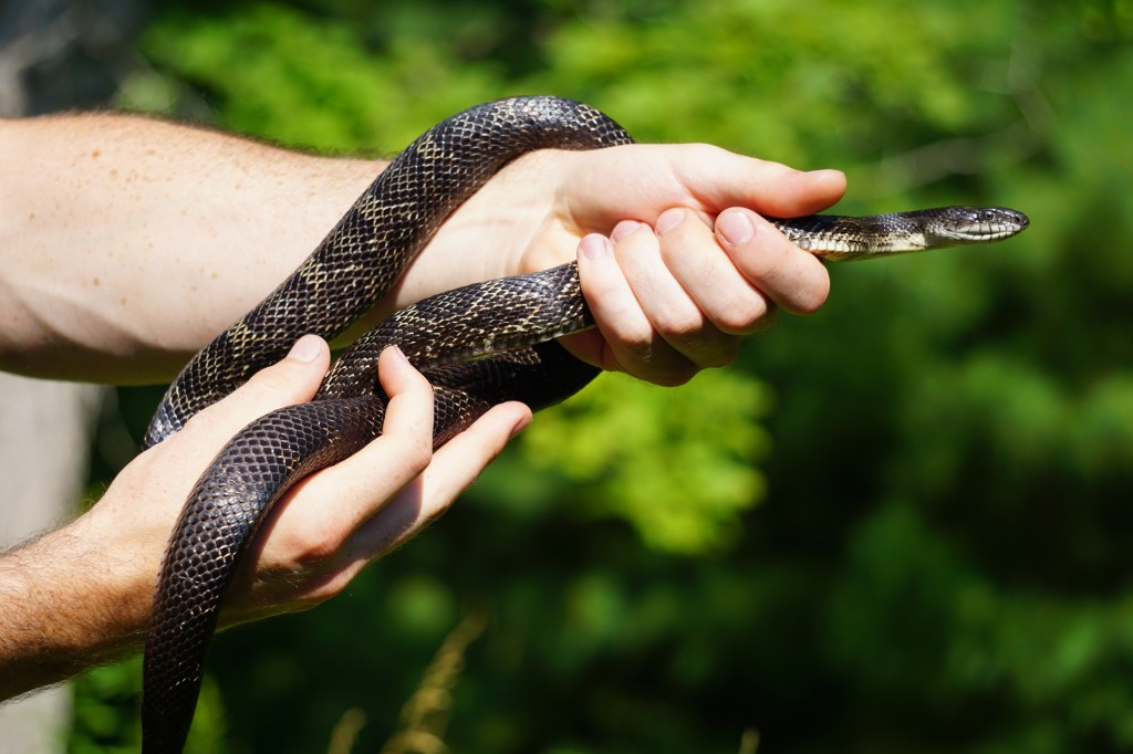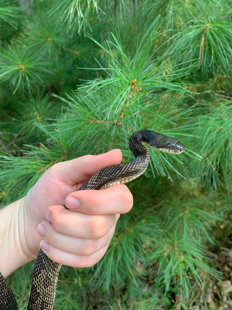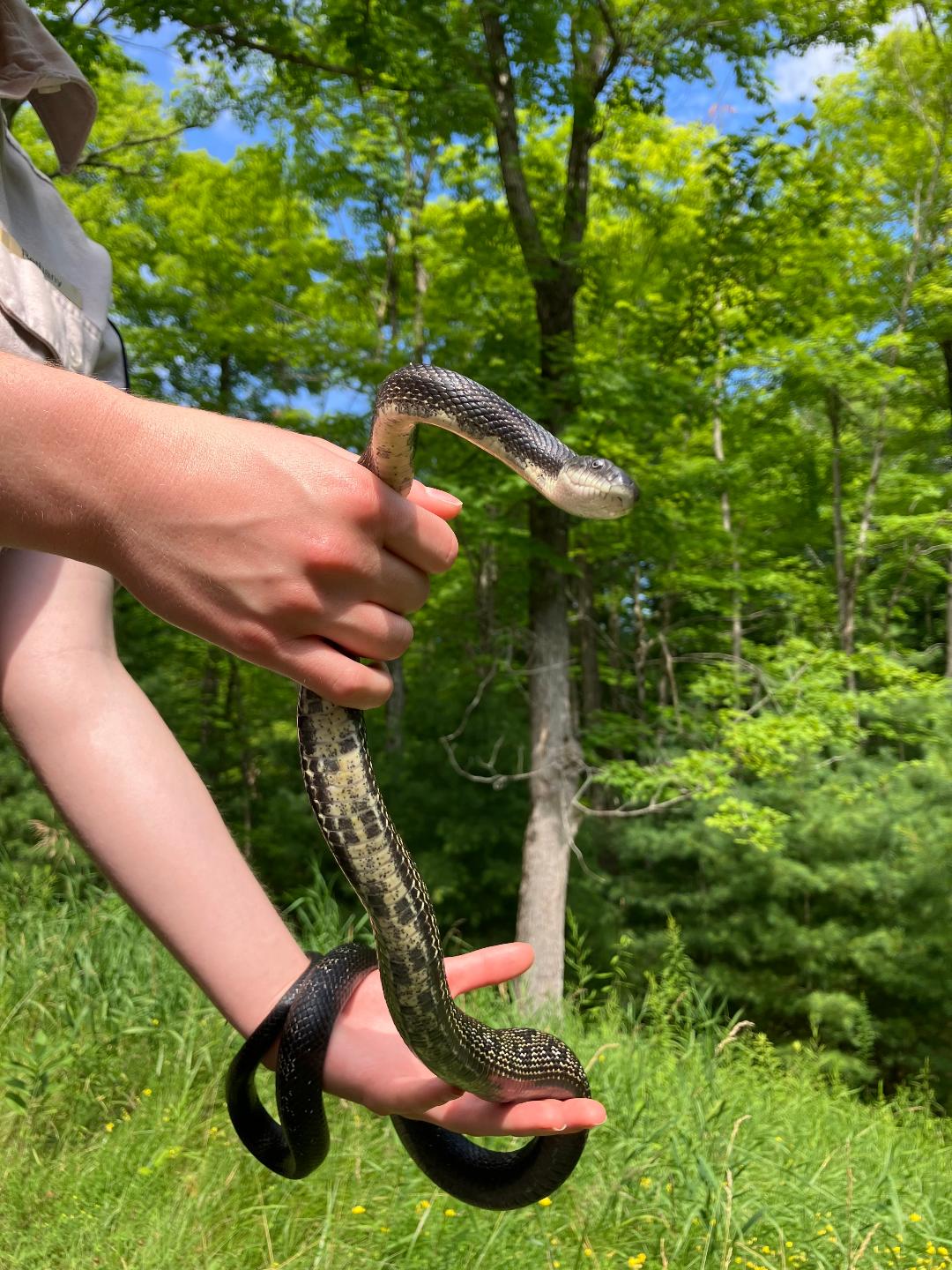 This male Gray Ratsnake was first found on July 30, 2021, near the bridge at McParlan House. He weighed 284 grams and measured 123.6 cm long. He was tense and somewhat unhappy to be found, and since staff didn’t have a pillowcase when he was found he was caught and carried to the van in a dragonfly net.