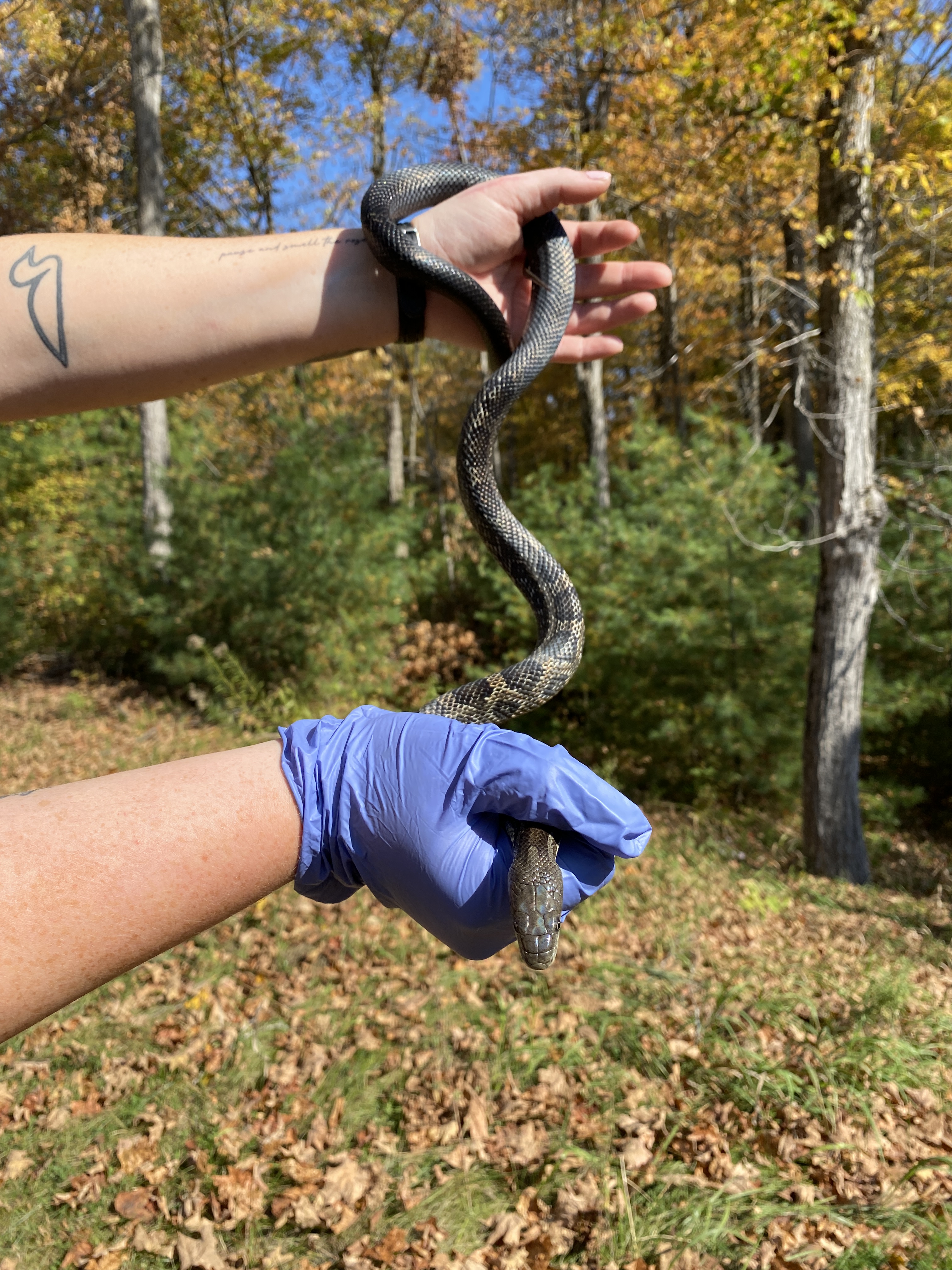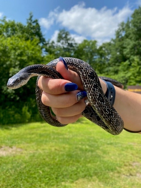 This female Gray Ratsnake was first found on August 6th, 2021, in the Fallows campground. She measured 120.7 cm long and weighed 430 grams. She was calm and friendly, and had some orange dots between her scales, potentially mites.