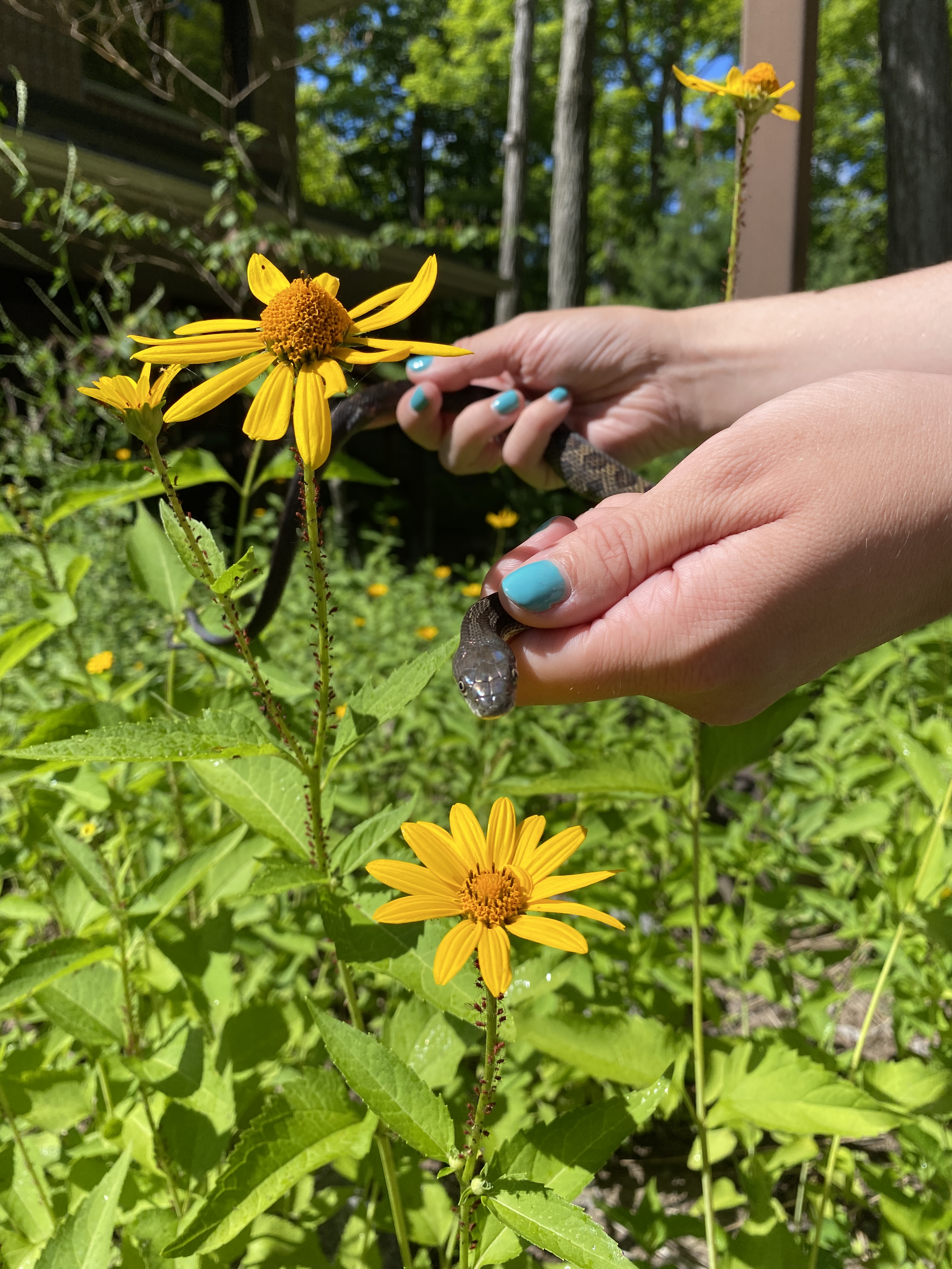 This snake was captured at the park staffhouse on June 13th, 2024 after being spotted through the kitchen window. She measured 116.25 cm and weighed 283 grams. This snake was very loving and hung out with staff on the porch for processing.