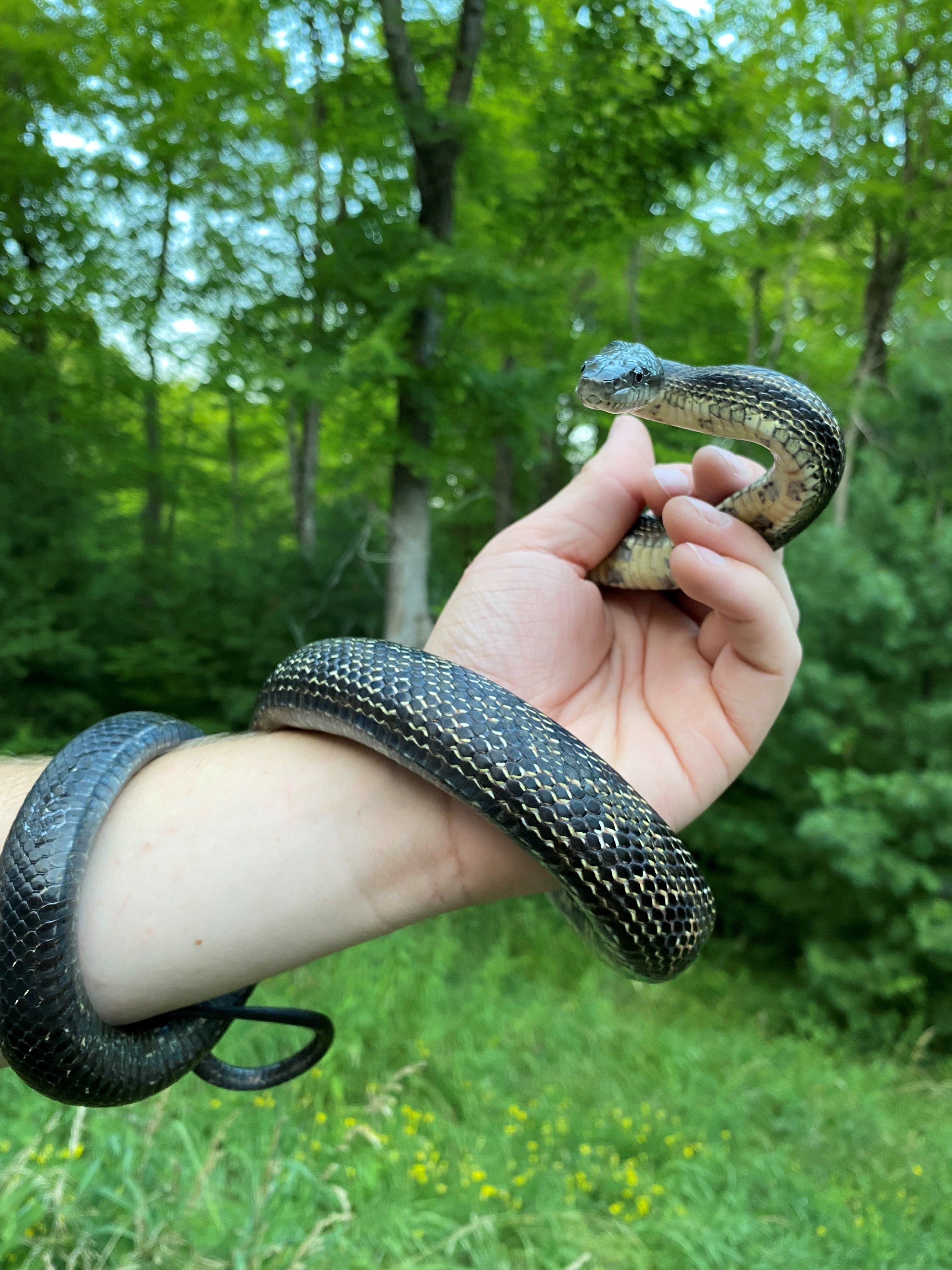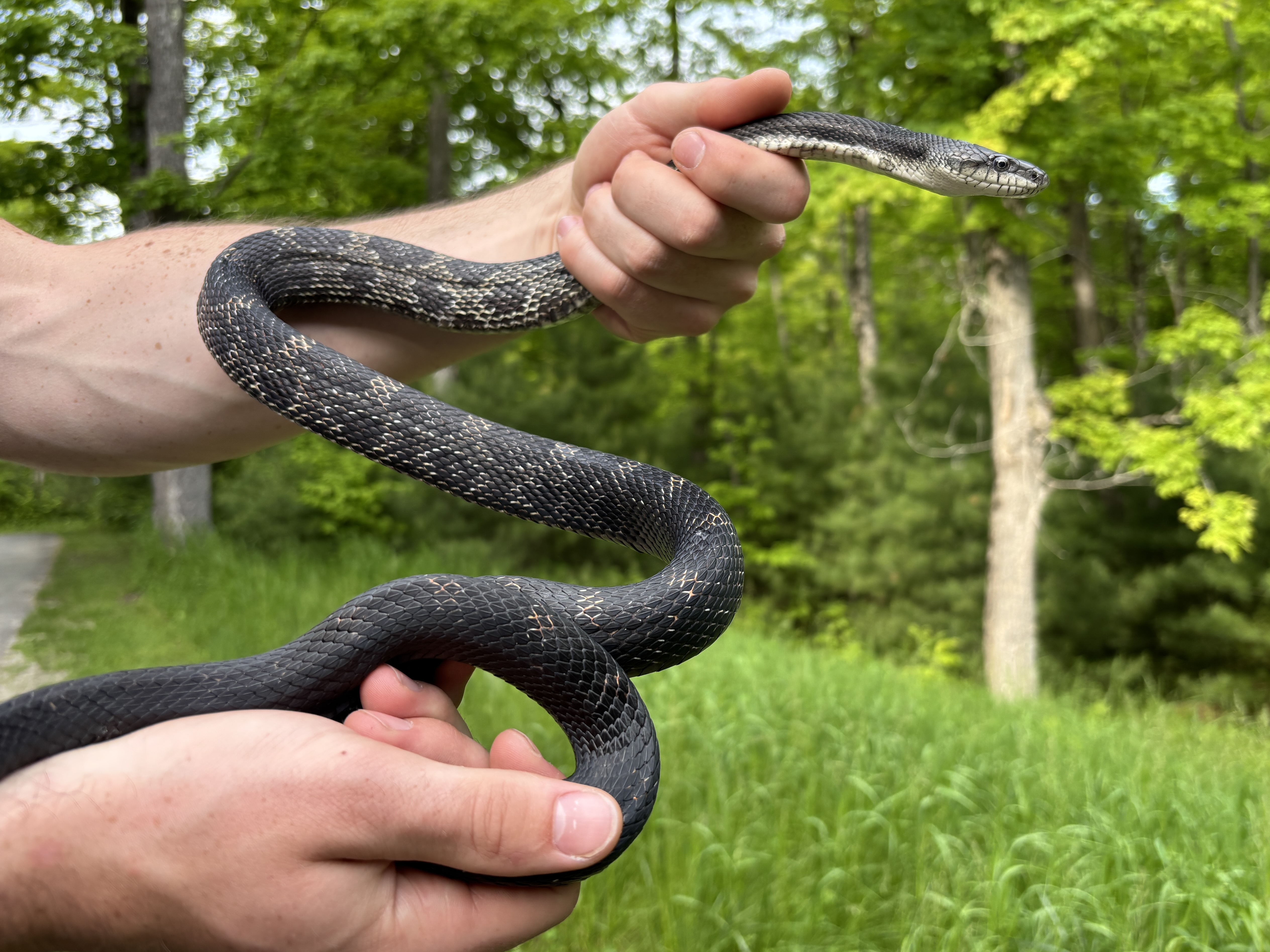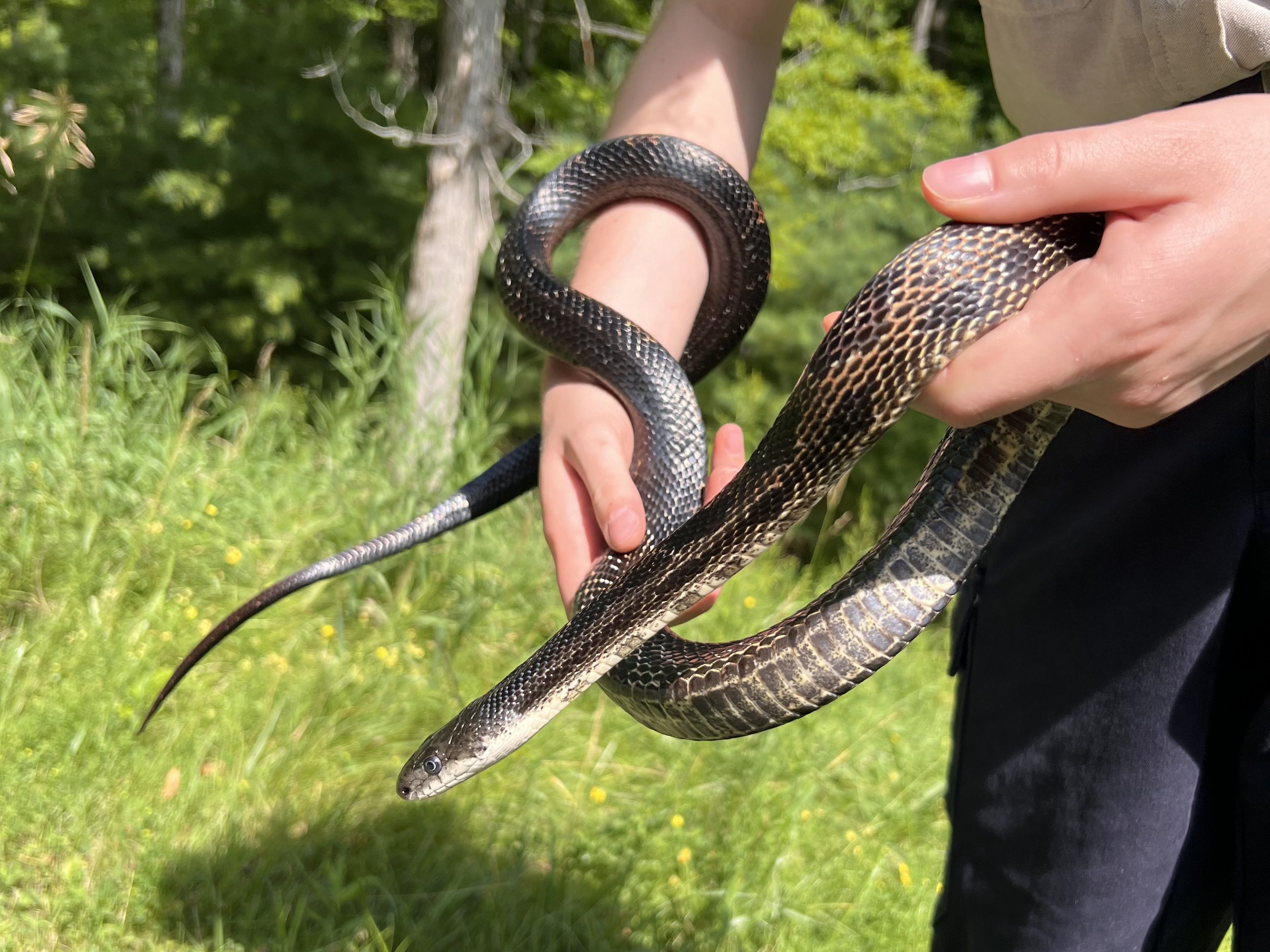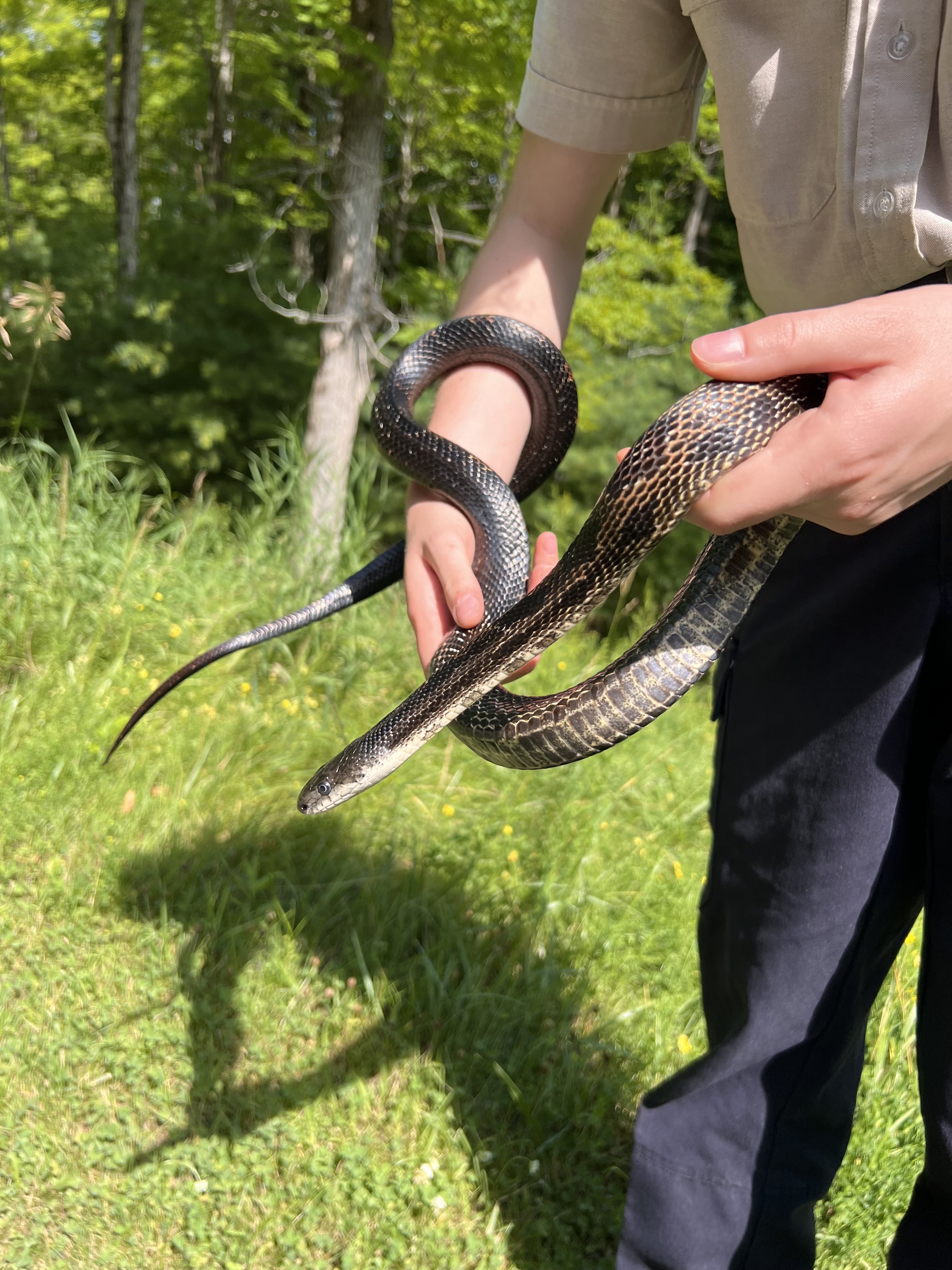 This male Gray Ratsnake was found in Fallows Campground on June 1st, 2023. He measured 132 cm and weighed in at 555 grams. When taking him back to be processed, he was quite lively. We even caught him dancing to the car radio!