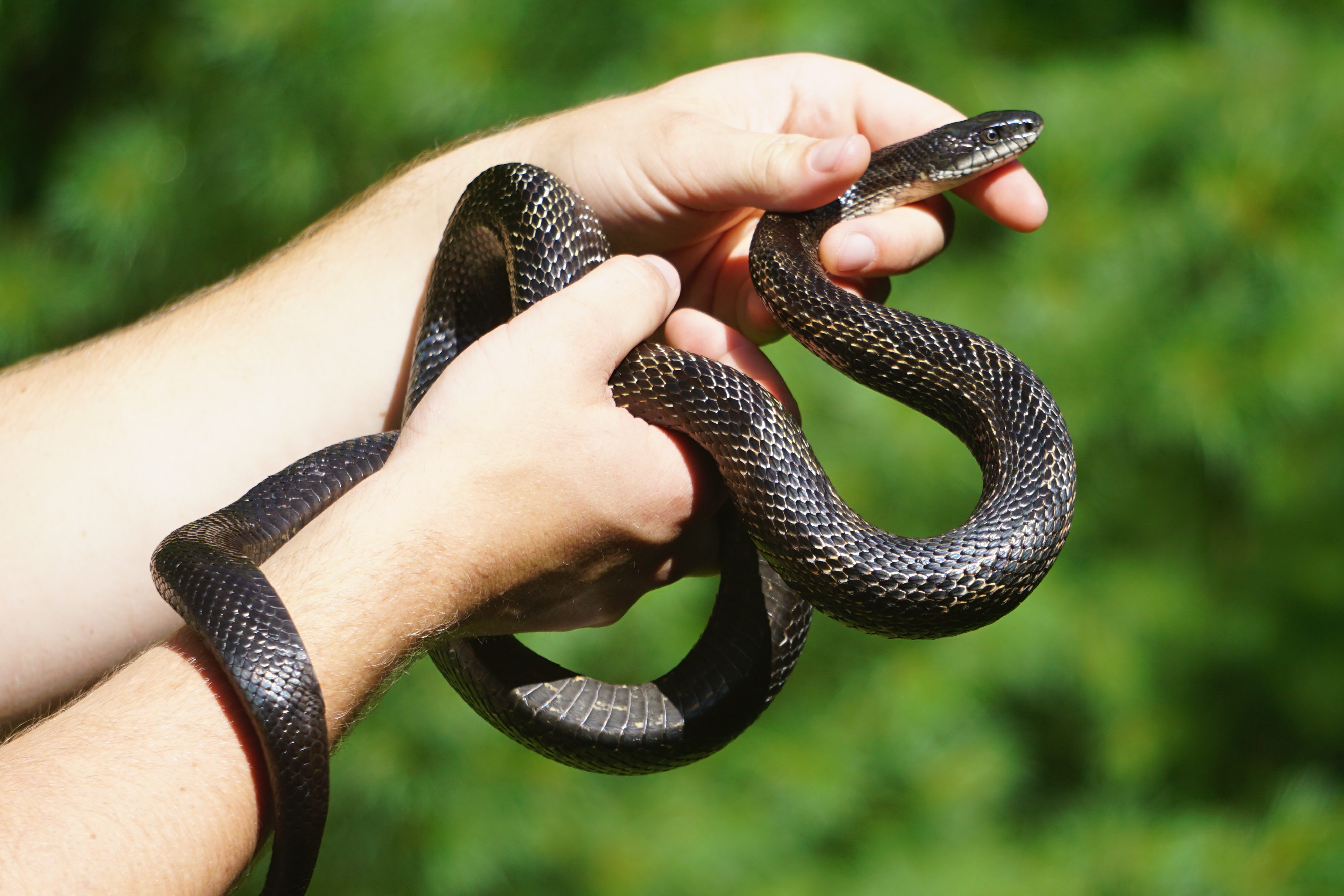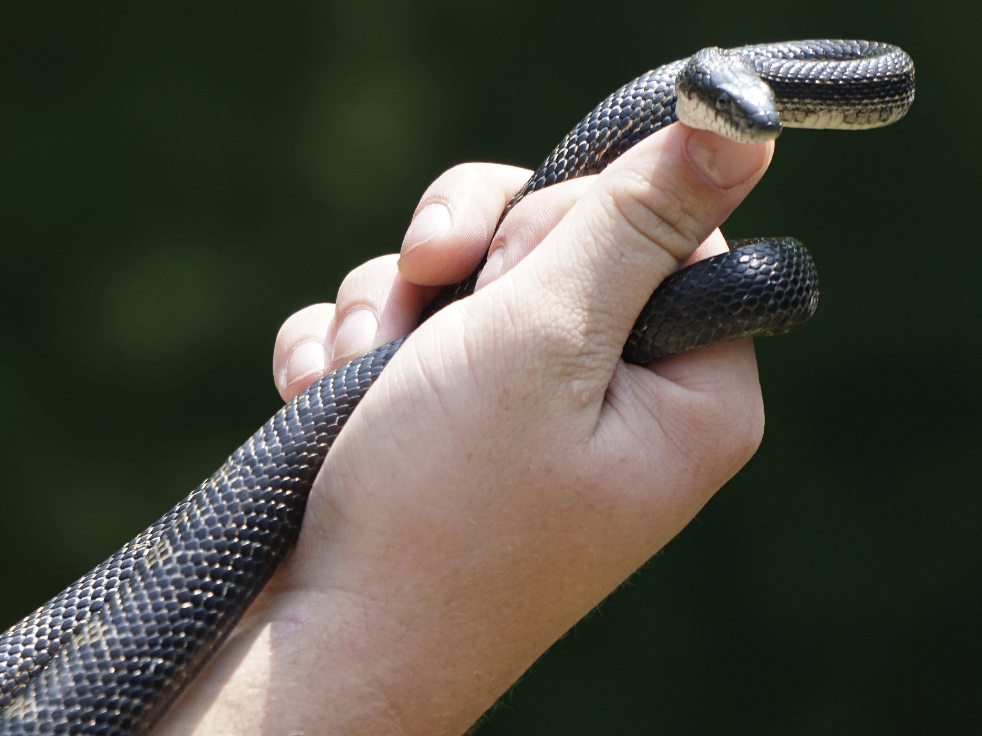 This female snake, found crossing Lally Road on July 20th, 2023, weighed in at 460 grams and measured 121.5 cm in length. She was very squirmy and curious during processing, but not aggressive. Her scales were strikingly shimmery!