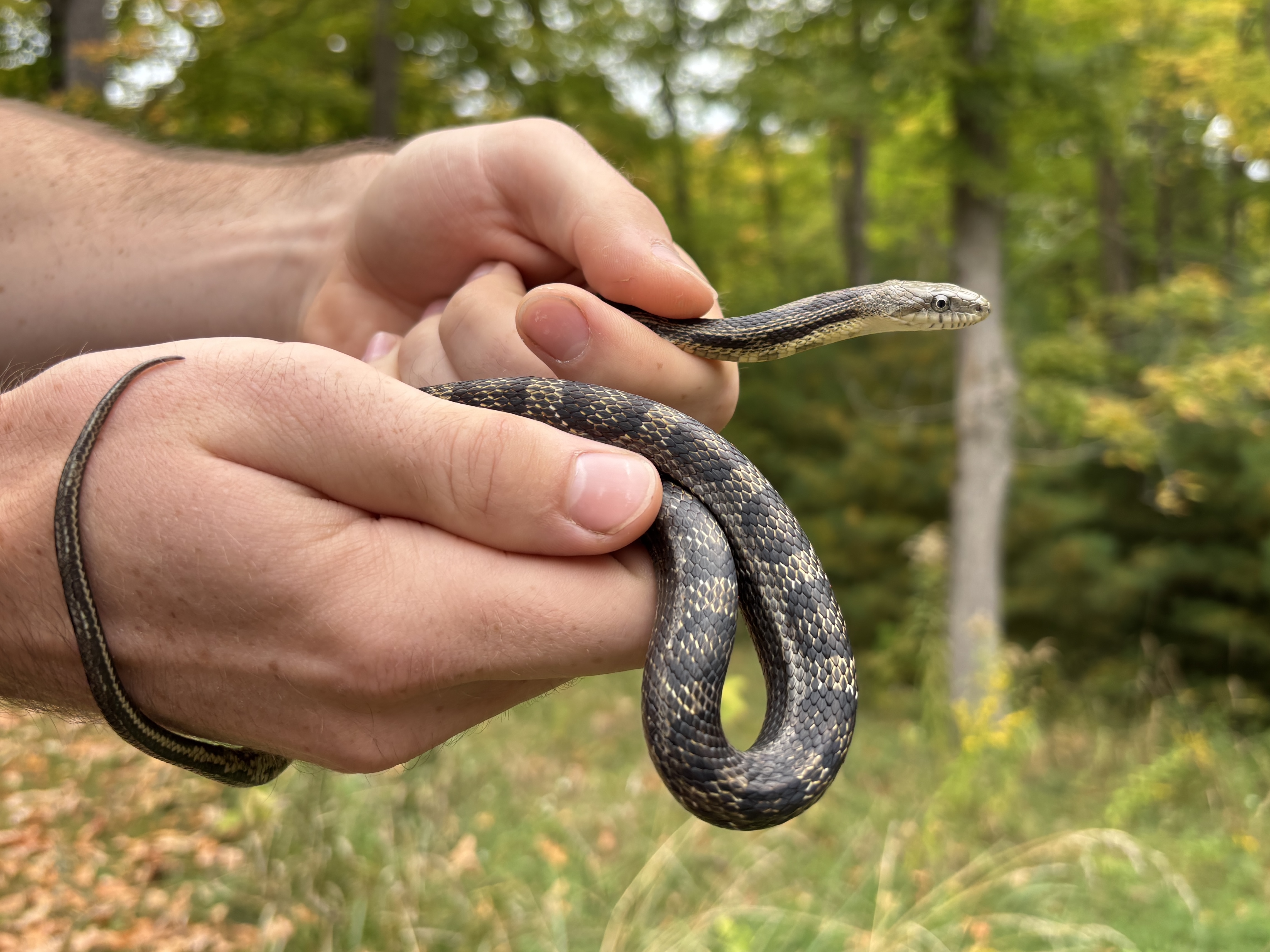 This snake was captured in the milk shed by the McParlan House on July 12th, 2024. She measured 119 cm and weighed 360 grams. She was very squirmy and seemed determined to escape during processing but otherwise friendly.